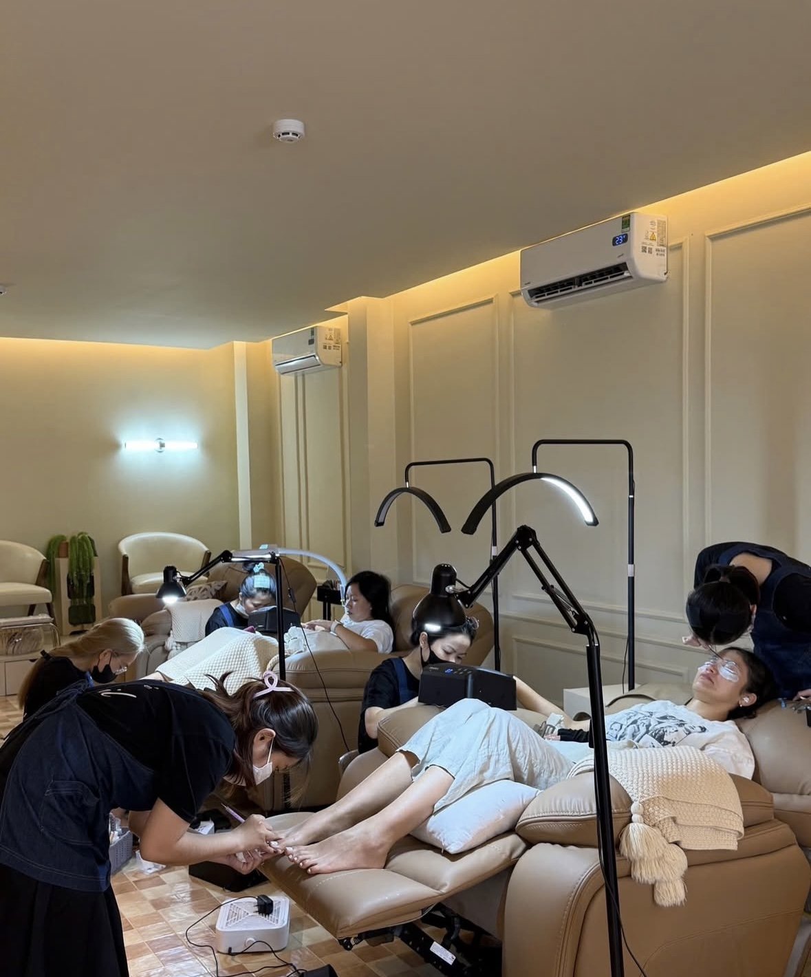 There are typically less nail ‘tables’ or ‘stations’ than there are people working and you are sharing spaces throughout your appointment. Each nail tech has their own cart of supplies and tools that they move around with them and are responsible for, but they share the working space. Also, there is usually someone who will bring around tea and snacks- like cookies- for you to enjoy during your appointment.